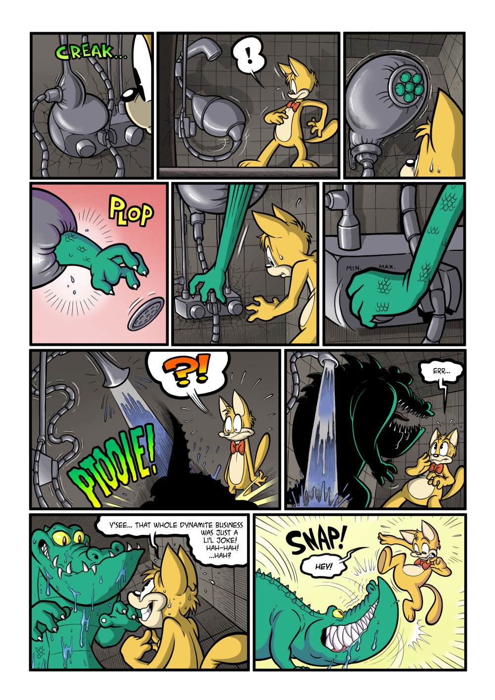 We're bilding up the the climactic showdown between man and beast! Or cat and beast, whatever. Those bulging pipes were pretty delightful to draw, even if this means halting the pacing of the comic to a crawl (for those of you exclusively following it on the web, that is). But this one has a fun climax worth waiting for! I hope.